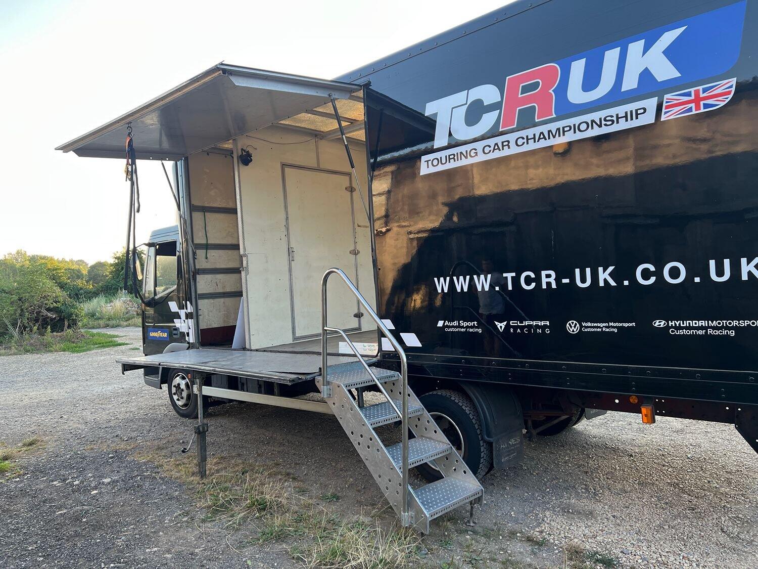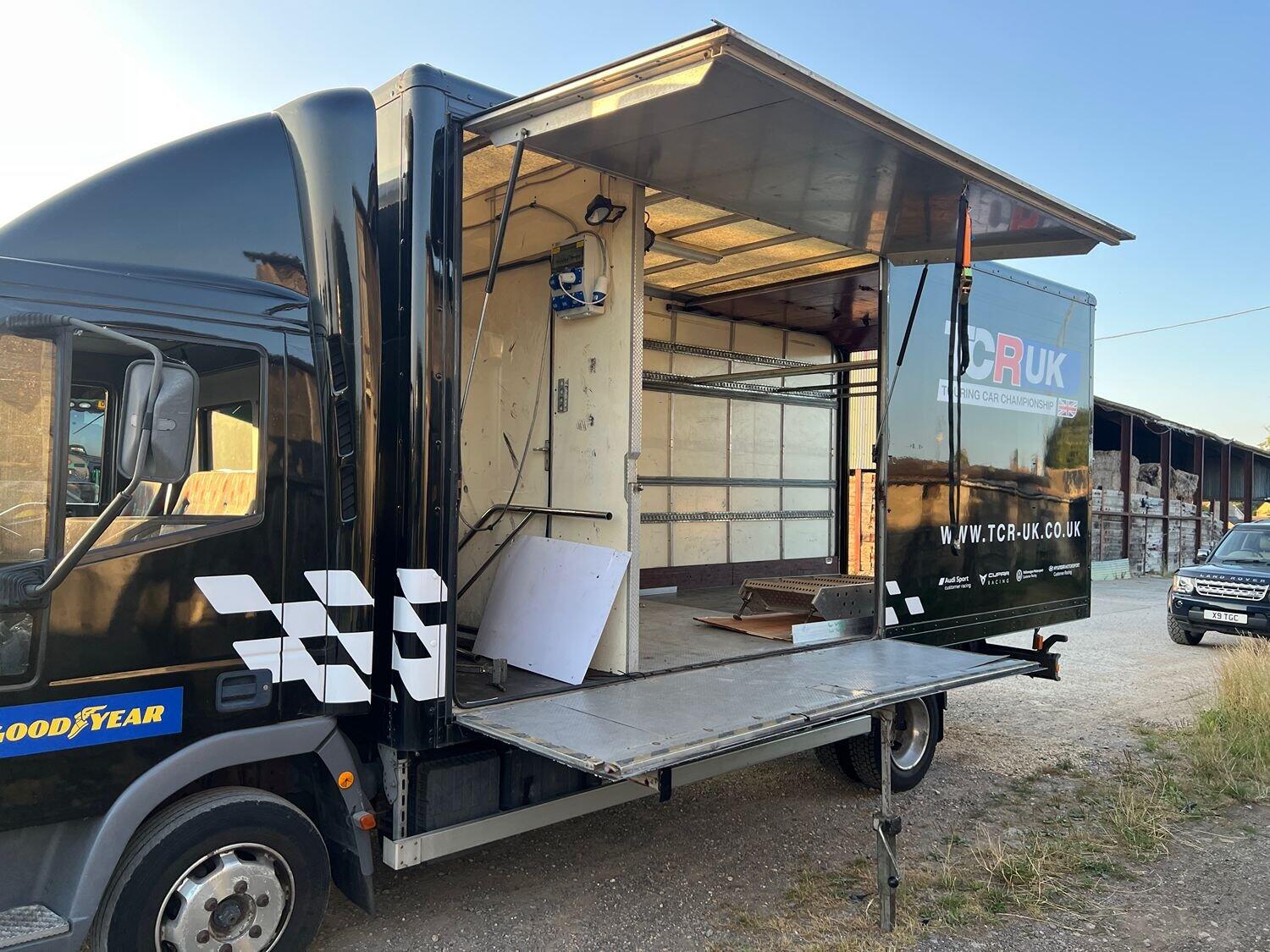 Has spent most of it's life in a motorsport paddock as a tyre van. Really well built box body with roller shutter door to rear in good working order. Single door to offside. Large fold out and lift out platform to nearside with staircase.