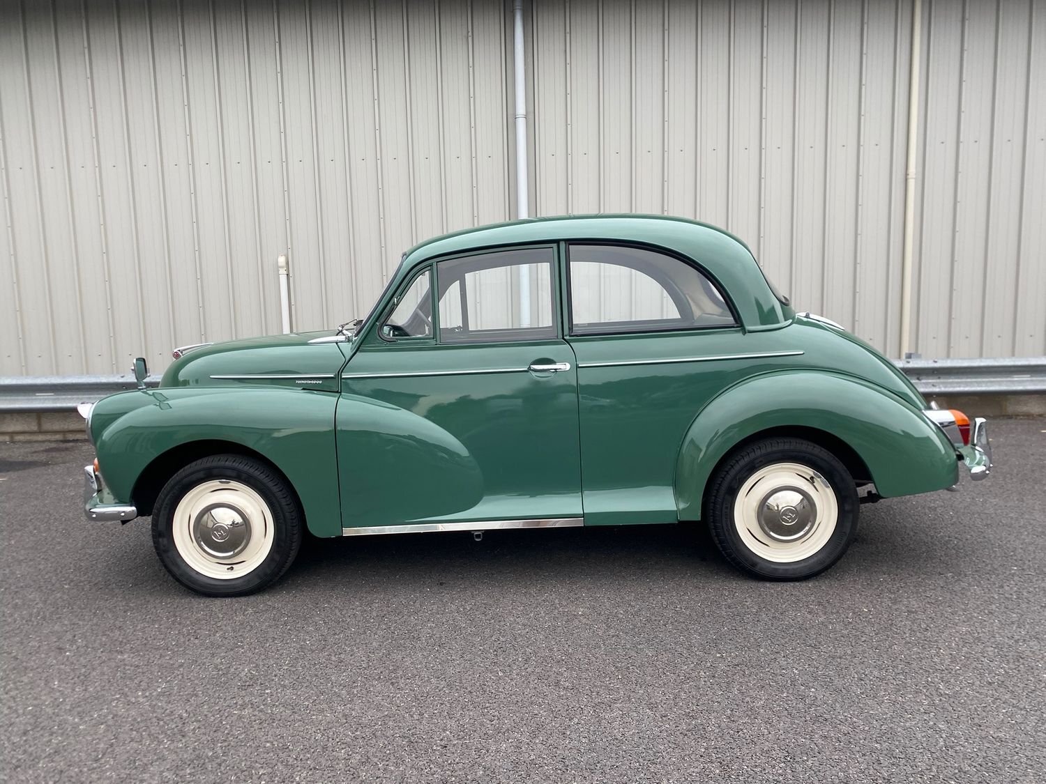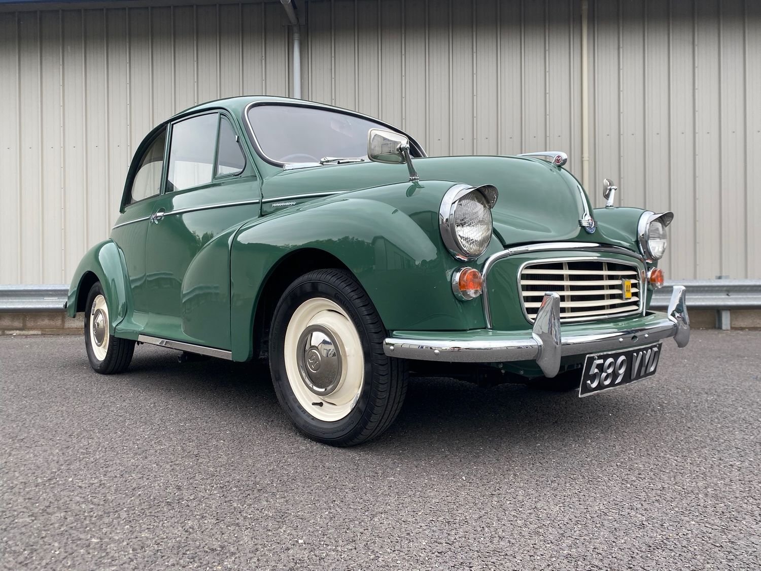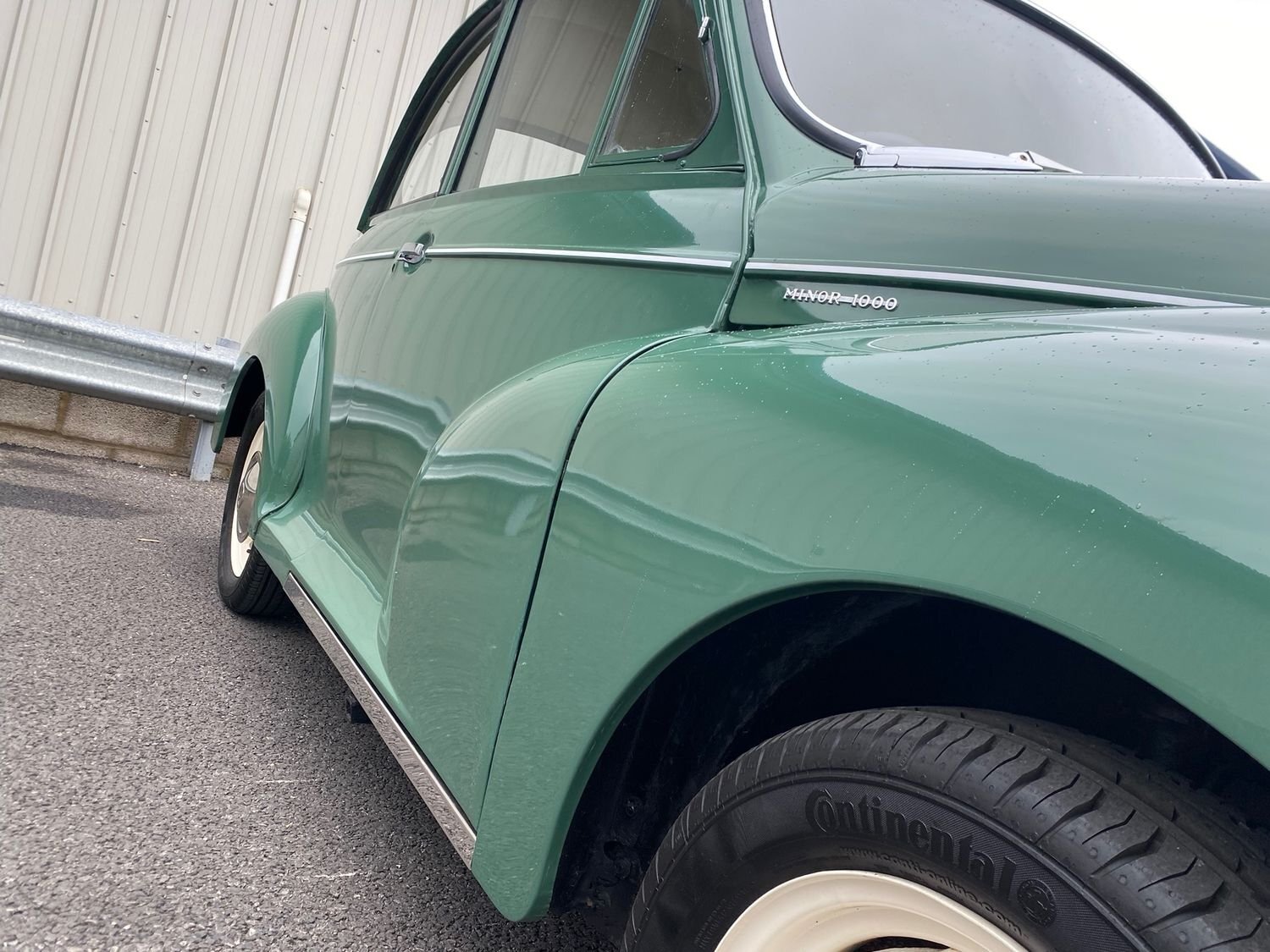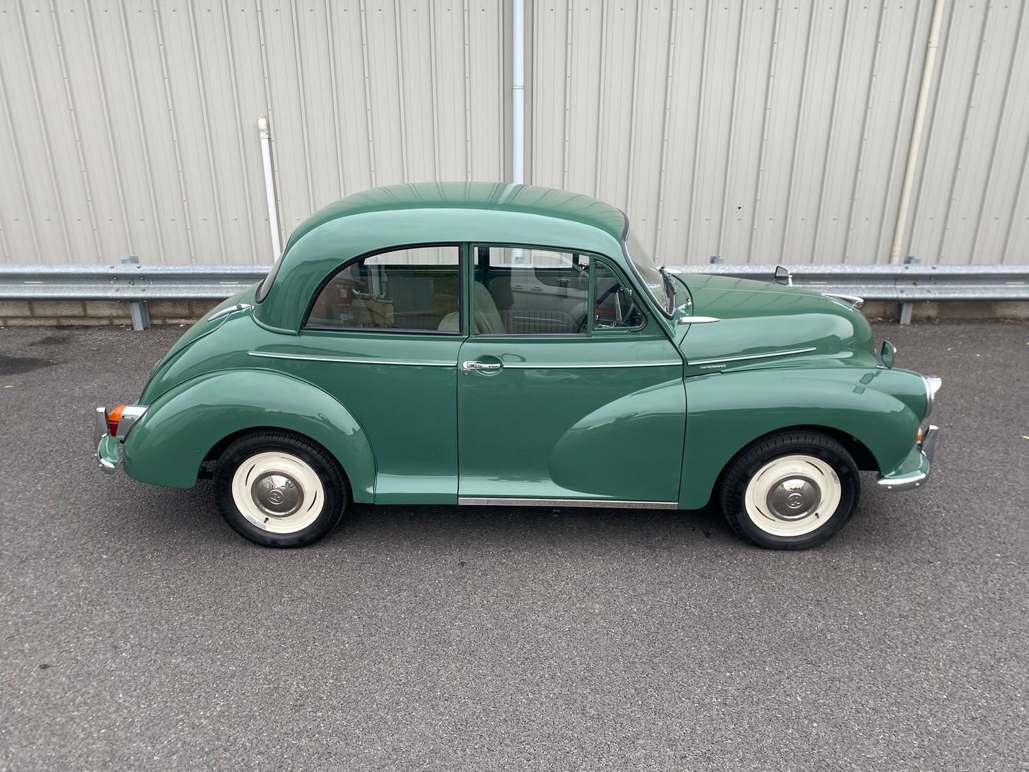 Hello and welcome to the sale of this fabulous Morris Minor. It was first registered in January 1964 and still wears it's original dateless Somerset registration number. It now has the benefit of being tax and MOT exempt. There is a large history file documenting extensive recent expenditure to the tune of several thousand pounds for mechanical, body and trim improvements. Notable new items include full exterior chrome, unleaded cylinder head, electronic ignition, coil, radiator, fuel pump, brake master cylinder, wheel cylinders and brake linings. It has also just been upgraded with a brand new brake servo giving welcome braking assistance and ensuring the car pulls up straight and true. All five wheels have been refurbished and shod with five premium continental tyres. The engine starts and runs perfectly with good power, delivering surprisingly zippy performance and that distinctive moggy sound! It must be mentioned that the gearbox on this car is particularly sweet with a very precise change and no crunching. The suspension and steering are tight providing a very pleasant driving experience. The Almond green paintwork is in lovely order, and whilst not to concourse standard is looking fresh with no damage or causes for concern. The shell itself has of course had work over the decades to keep the old girl on the road, no doubt with repairs as necessary and a thorough undersealing in more recent years still giving a presentable finish today. Another highlight is the beautiful green interior, which benefits from freshly trimmed seats and carpets, and features many of the lovely details of the older cars including the pretty cream coloured speedo on the earlier style dash and the pull-starter button. To sum up this is a very attractive, presentable and authentic survivor car, that whilst has not undergone a full nut and bolt restoration is nonetheless looking, running and driving very well due to the care and expenditure that has clearly been lavished upon it, and I am sure the new owner will be very pleased.
