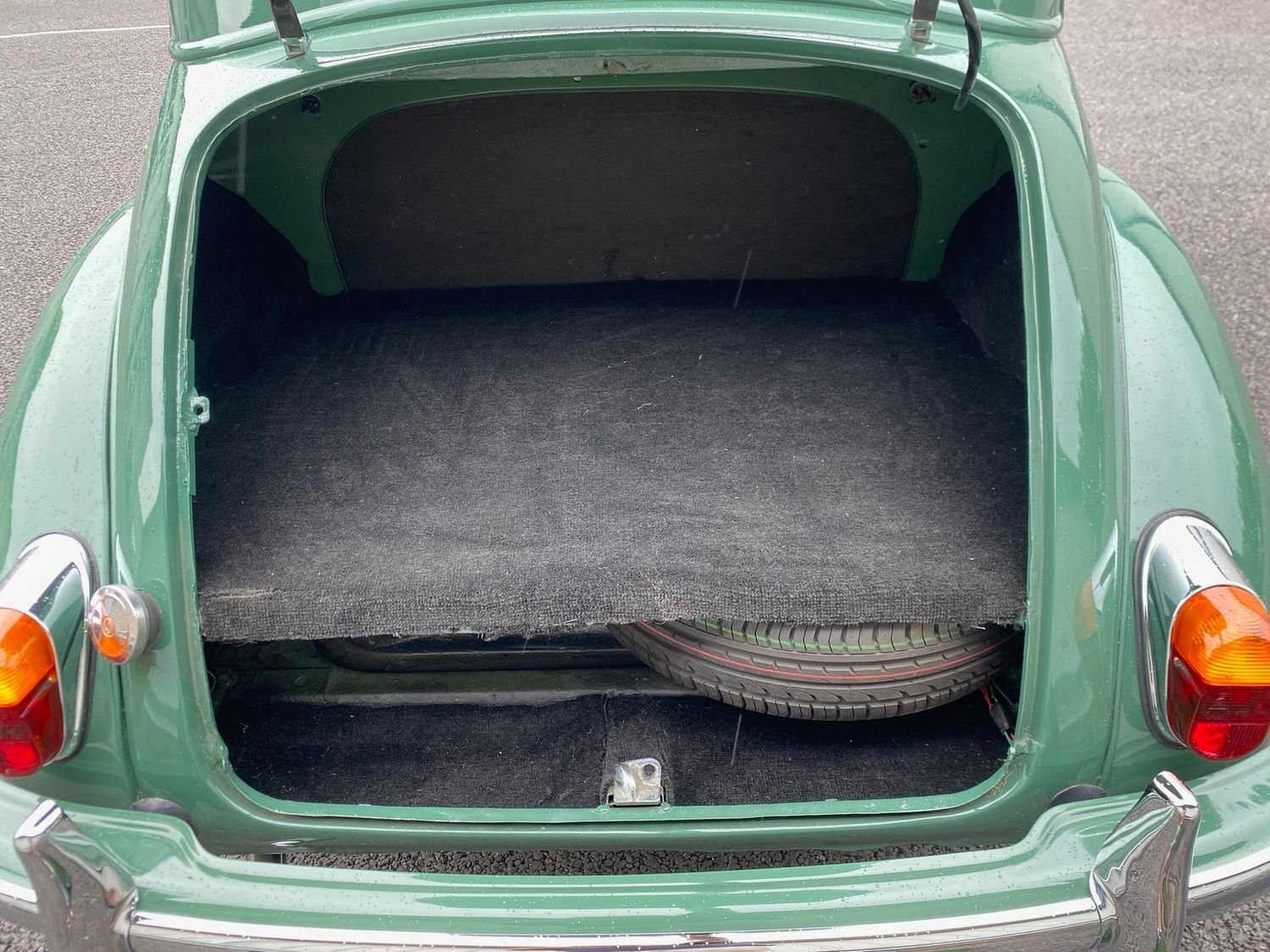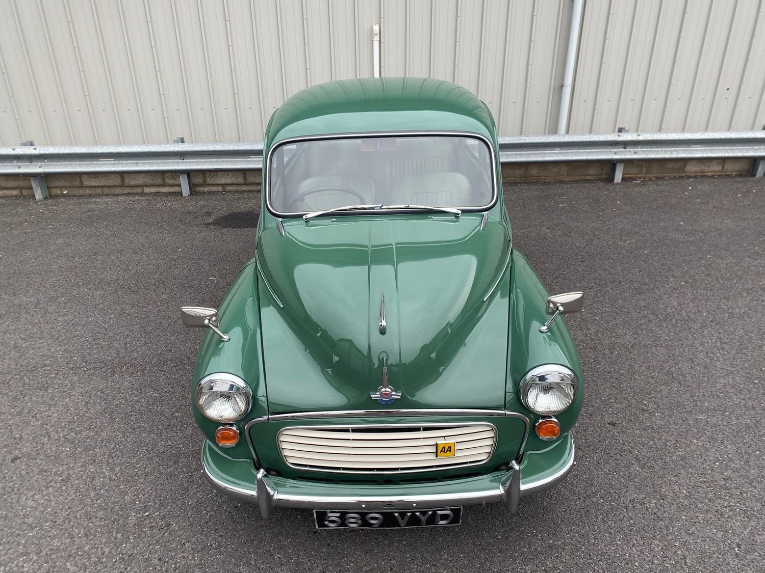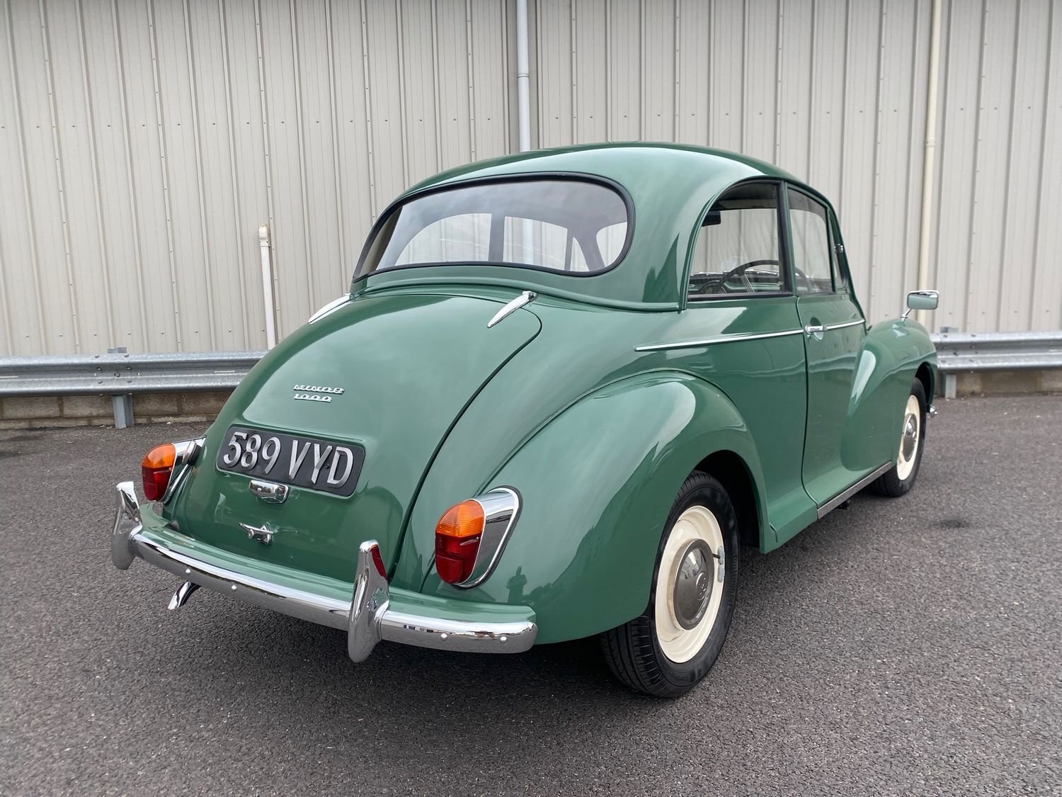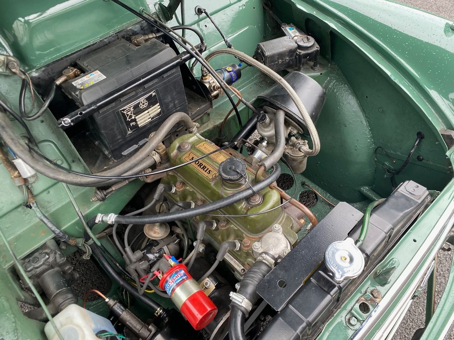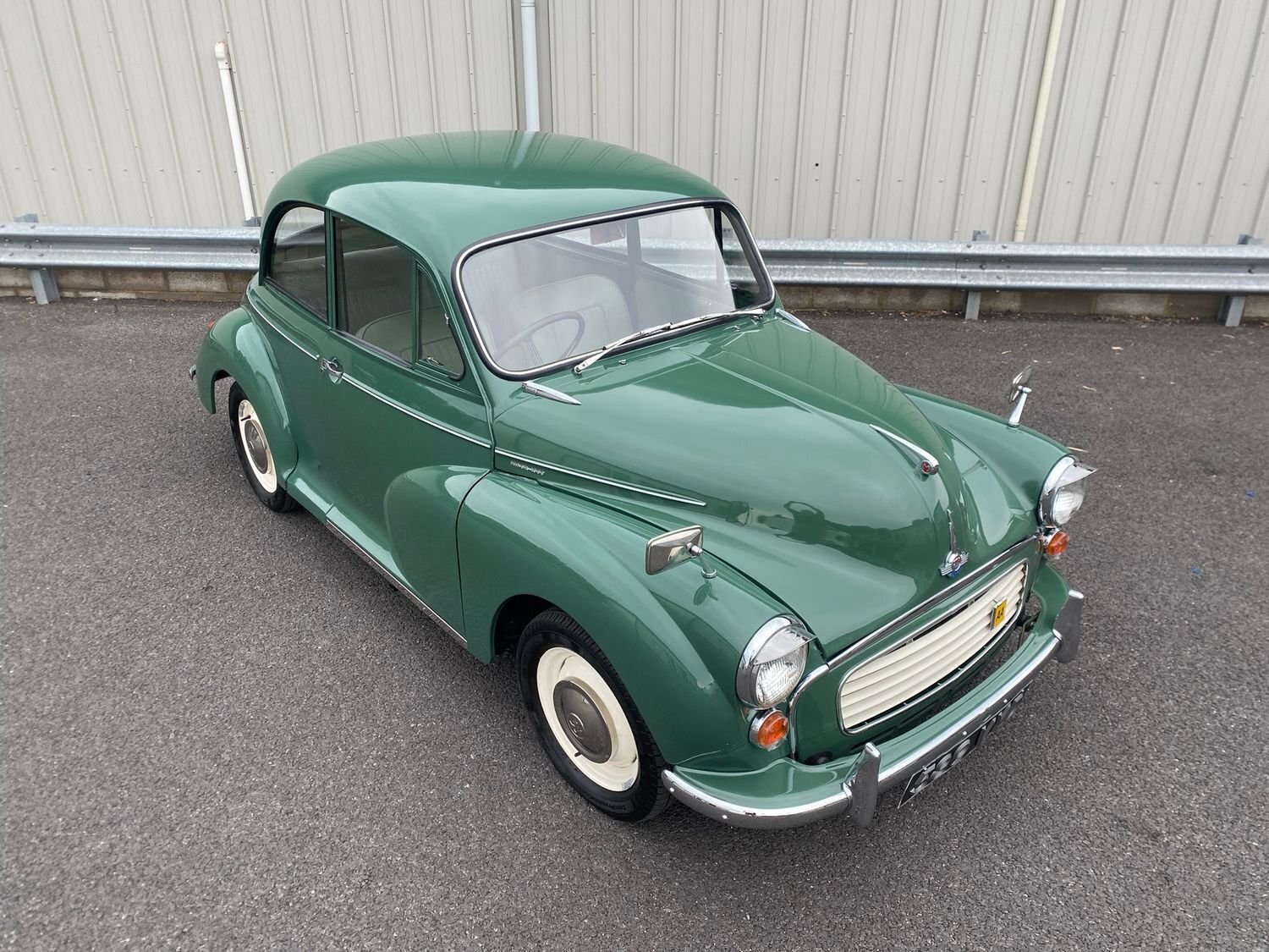 Hello and welcome to the sale of this fabulous Morris Minor. It was first registered in January 1964 and still wears it's original dateless Somerset registration number. It now has the benefit of being tax and MOT exempt. There is a large history file documenting extensive recent expenditure to the tune of several thousand pounds for mechanical, body and trim improvements. Notable new items include full exterior chrome, unleaded cylinder head, electronic ignition, coil, radiator, fuel pump, brake master cylinder, wheel cylinders and brake linings. It has also just been upgraded with a brand new brake servo giving welcome braking assistance and ensuring the car pulls up straight and true. All five wheels have been refurbished and shod with five premium continental tyres. The engine starts and runs perfectly with good power, delivering surprisingly zippy performance and that distinctive moggy sound! It must be mentioned that the gearbox on this car is particularly sweet with a very precise change and no crunching. The suspension and steering are tight providing a very pleasant driving experience. The Almond green paintwork is in lovely order, and whilst not to concourse standard is looking fresh with no damage or causes for concern. The shell itself has of course had work over the decades to keep the old girl on the road, no doubt with repairs as necessary and a thorough undersealing in more recent years still giving a presentable finish today. Another highlight is the beautiful green interior, which benefits from freshly trimmed seats and carpets, and features many of the lovely details of the older cars including the pretty cream coloured speedo on the earlier style dash and the pull-starter button. To sum up this is a very attractive, presentable and authentic survivor car, that whilst has not undergone a full nut and bolt restoration is nonetheless looking, running and driving very well due to the care and expenditure that has clearly been lavished upon it, and I am sure the new owner will be very pleased.