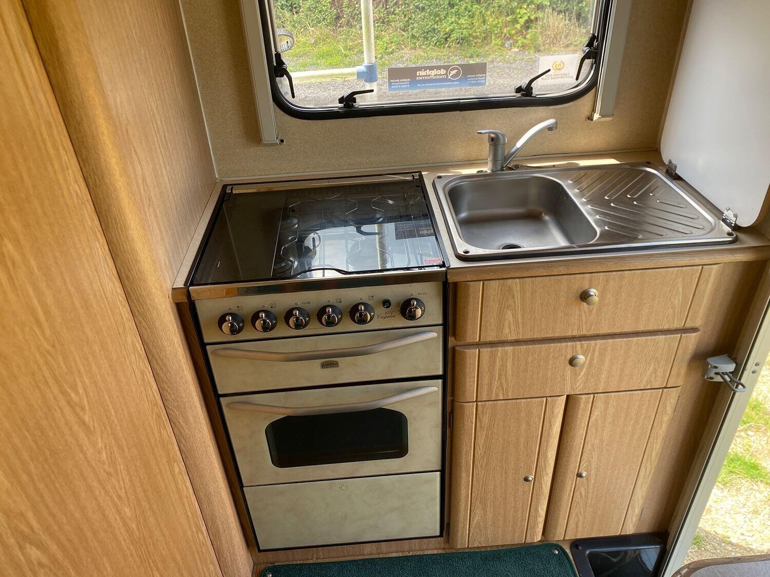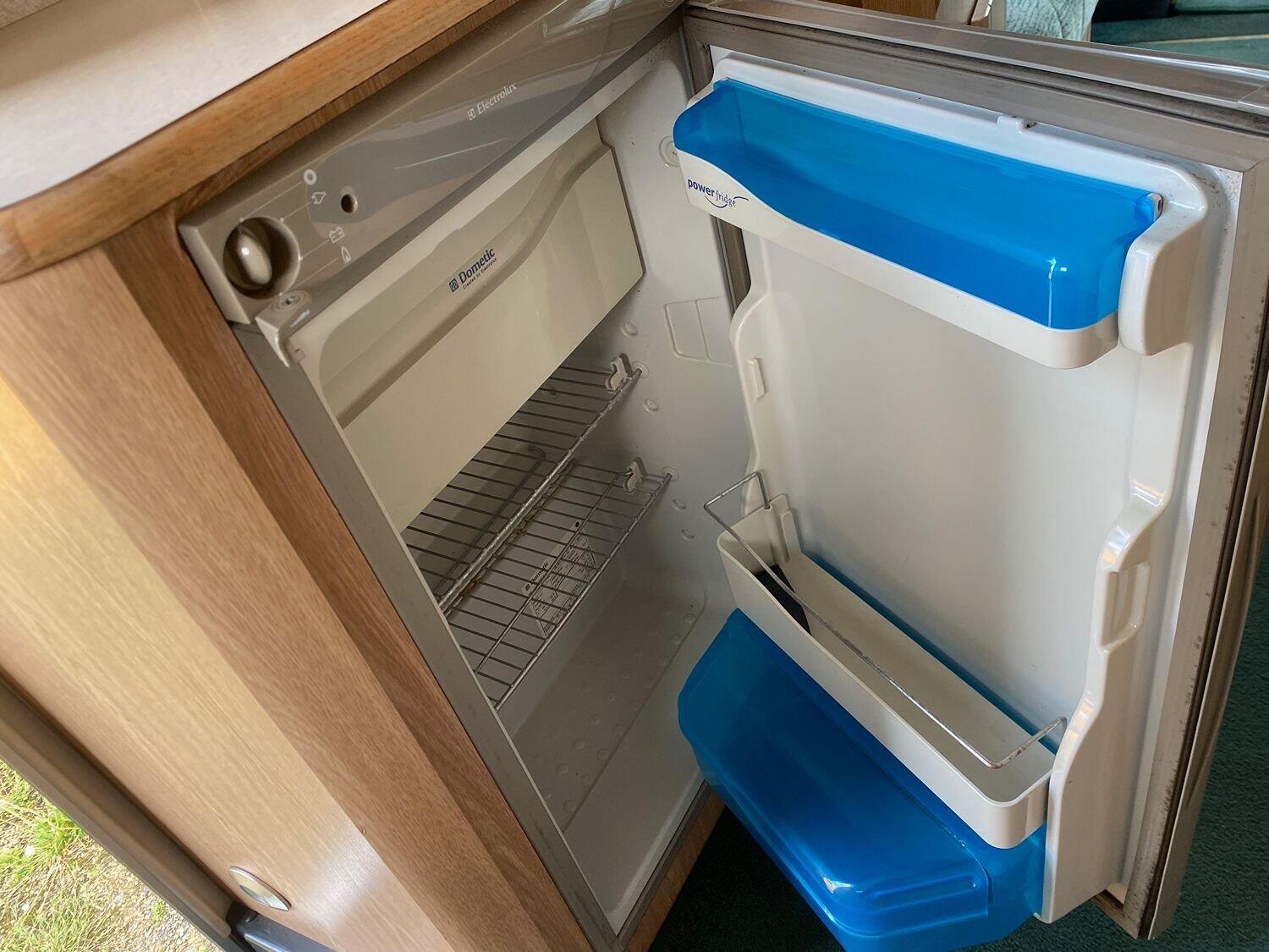 It provides a comfortable layout for two people, with two separate sofas that can convert to a double. There is plenty of natural light from the roof lights and all the blinds and curtains are in nice order. It has the usual cooking and washing facilities, fridge, toilet and ample storage. There is also a wind out awning and a handy bike rack.