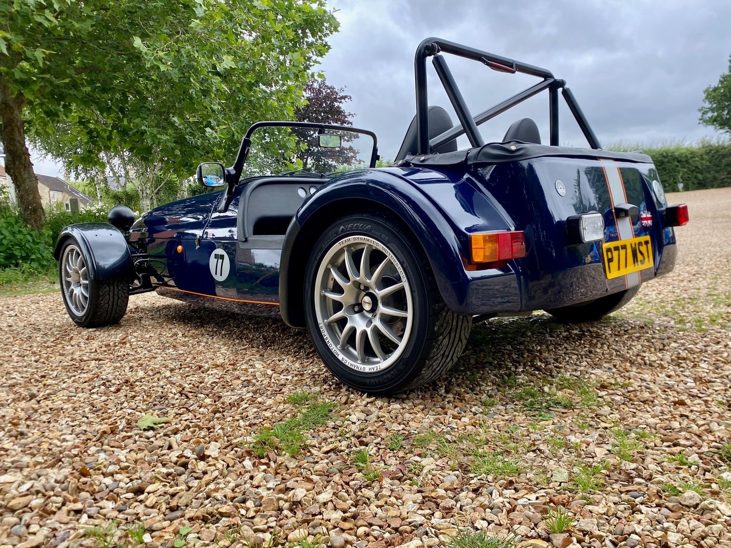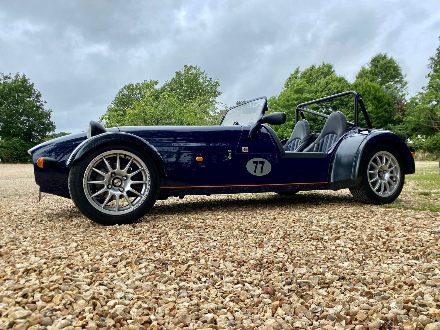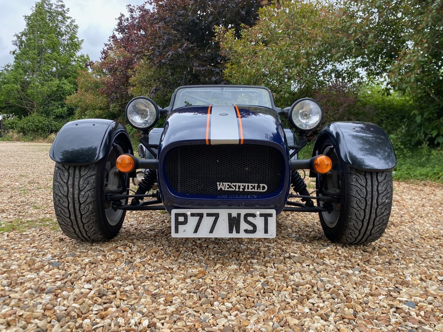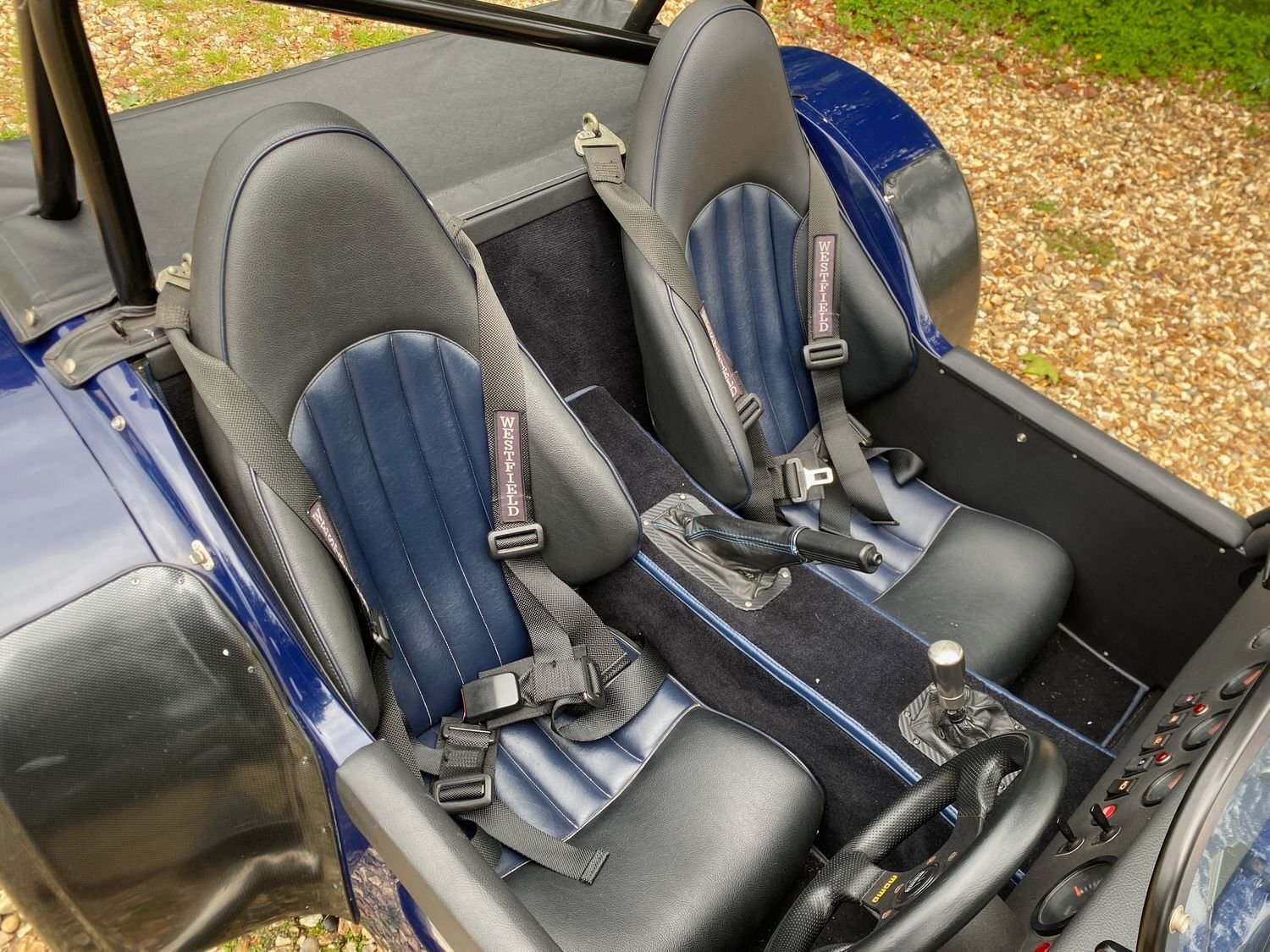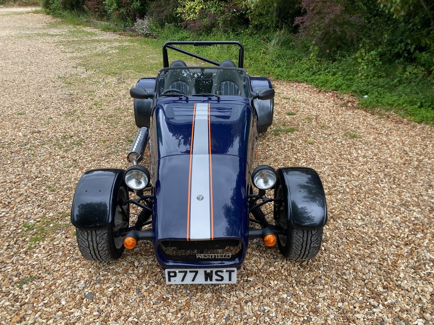 Hello and welcome to the sale of this superb Westfield Sport. It has had just three previous keepers, and has covered just 14k miles. It comes with a comprehensive history file, including spec sheets and workshop manuals. It is a 2007 registered car, currently wearing the private plate 'P77 WST', which can be included in the sale if desired. It would revert to an '07' reg, and is obviously not a Q plate as many usually are. Whilst not a hugely powerful or high spec competition vehicle, this has been very thoughtfully put together car which provides enormous pleasure for fast road use or summer cruising. The 1600cc Ford Sigma engine is a modern and well regarded power unit, pushing out in the region of 140bhp through the 5 speed manual gearbox. It sounds great through the side exit sports exhaust, without being overpowering. It will also return great economy, and is simple to run and maintain with great parts availability. Brakes are the well regarded 'Hi-Spec' version, providing good stopping power. The suspension is well set up with minimum roll through the corners whilst maintaining excellent ride quality and no bottoming out. The rear suspension is independent. The silver Team Dynamics alloy wheels are in immaculate condition with premium Yokohama tyres all round, and comes with a full size spare wheel and carrier, not currently fitted but included. The carbon fibre style arches look the part, and the attractive exterior colour combination of blue with silver and orange pin stripes is complimented by the matching dark blue and black leather interior trim, which is all in great condition and very neatly finished. Additional gauges and warning lights for coolant, battery and oil etc have been fitted to keep the driver informed. It has a red starter button on the dash, and a cool Momo steering wheel. It has the much improved 'RAC' style roll bar / hoop, which not only looks much better but provides far better protection for the occupants. It has four point harnesses fitted for both driver and passenger. This is the widebody version, giving increased levels of driver comfort, ideal if like me you are of larger proportions! It comes with full wet weather gear including roof and doors, all in great condition with no rips or tears. It also has a heated front screen, which is very handy to prevent the screen misting up, along with fully functioning wipers and screenwashers. It starts, runs and drives very well indeed, extremely compliant on the road with no knocks or bangs, it accelerates hard through the gears and pulls up square under braking. It is capable of satisfyingly brisk and enjoyable performance without the quite frankly sheer terror of some of the more powerful Westfields and Caterhams that I have been in! To sum up, this is an extremely well thought out, nicely put together Westfield, with a great configuration and powertrain. It is in fantastic condition throughout and is ready for the next owner to enjoy.